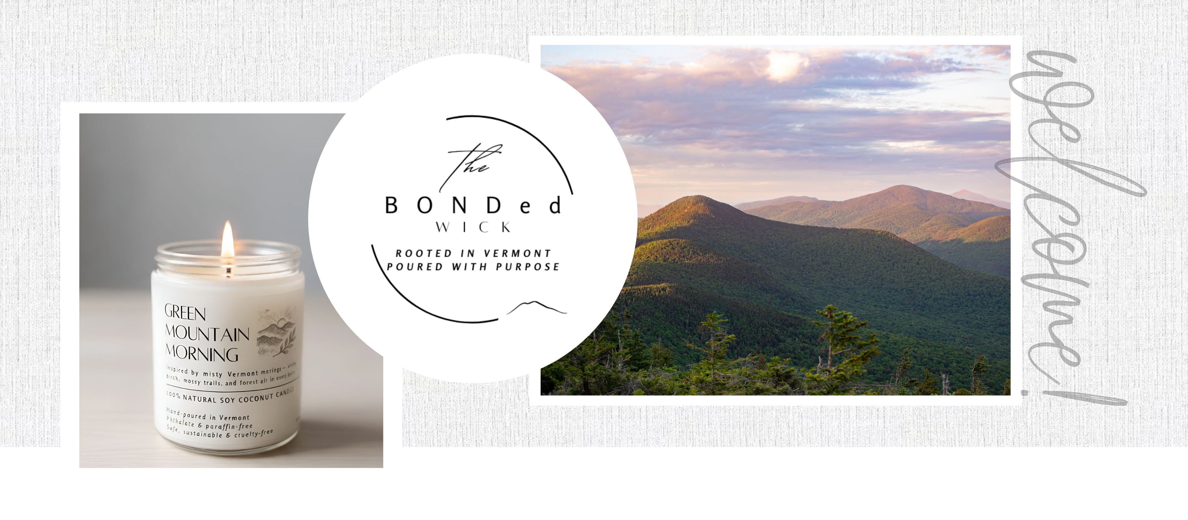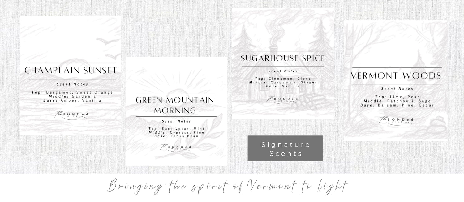 At The BONDed Wick, every candle is a quiet reminder — to slow down, breathe deep, and savor the moment. We draw inspiration from misty mornings in the Green Mountains, woodsmoke drifting from a sugarhouse, and the golden glow of a Champlain sunset.