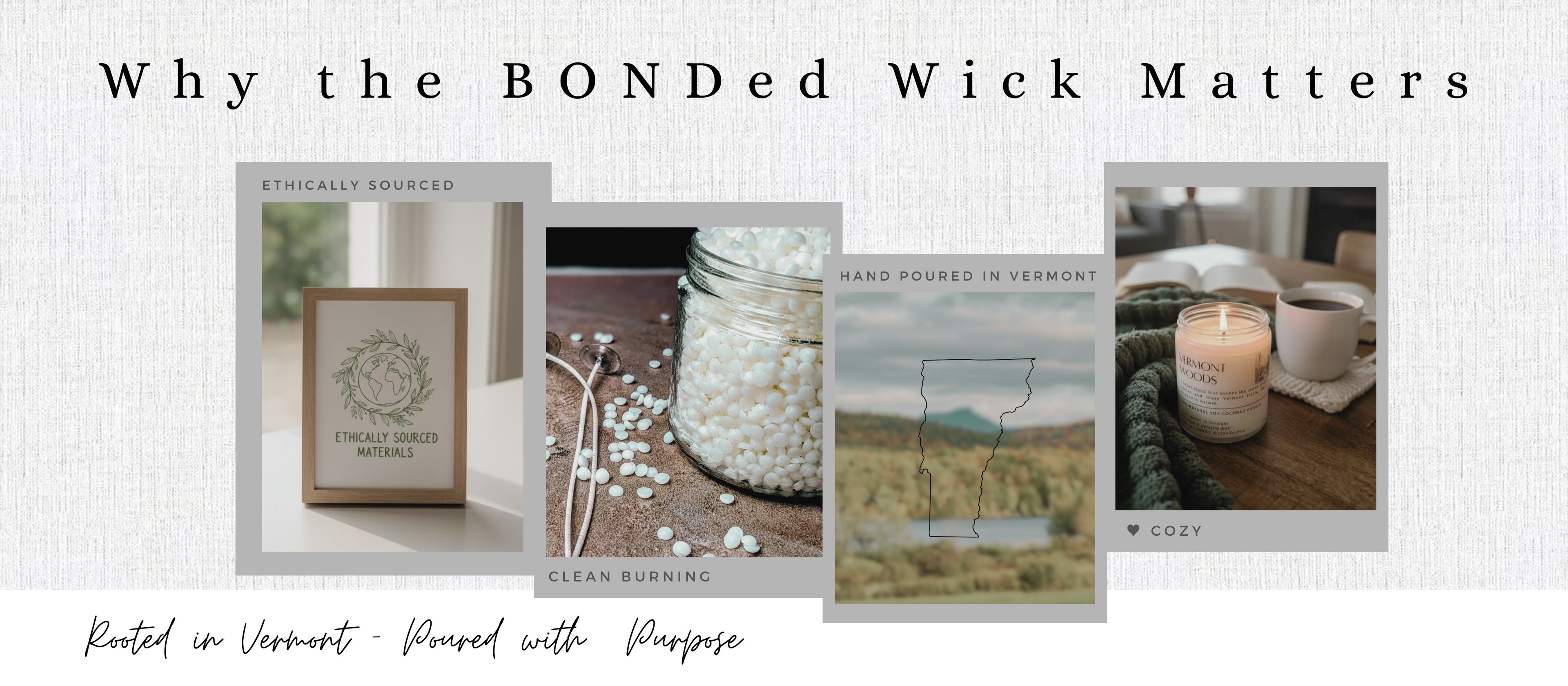 At The BONDed Wick, every candle is a quiet reminder — to slow down, breathe deep, and savor the moment. We draw inspiration from misty mornings in the Green Mountains, woodsmoke drifting from a sugarhouse, and the golden glow of a Champlain sunset.